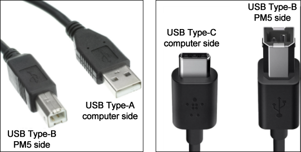 This method requires a USB cable that has a USB Type-B plug on one end for plugging into the Performance Monitor, and either a USB Type-A or USB Type-C plug on the other end for connecting to your computer (this is the same cable used to plug in a printer). Please check your computer to see what type of USB plug it accepts. Refer to the images below for help.